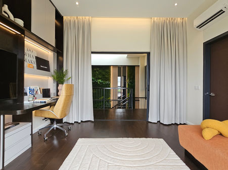 Serenia Aqila presents Serenia City's exclusive semi-detached homes (3,000+ sqft, 5+1 beds, 5 baths), each featuring unique non-identical frontages that create a premium bungalow streetscape. Designed during the pandemic for modern living, these biophilic retreats combine luxury with nature through internal skylit gardens, semi-open baths with shower planters, and integrated herb gardens. The multi-generational layout includes a wheelchair-accessible Garden Suite, a lavish Master Bedroom with balcony, walk-in wardrobe and dramatic sloping roof, plus a flexible home-office bedroom. Sustainable features like EV-ready car porches, rainwater harvesting, and solar readiness complete this sanctuary of wellness and sophistication.